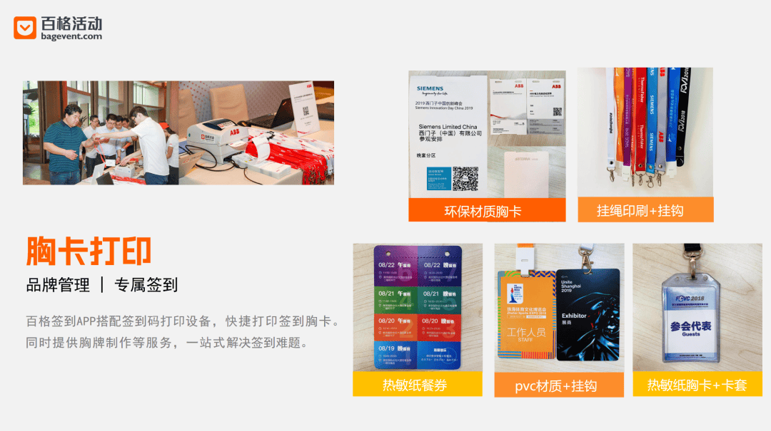 胸卡材质:包括高档PVC胸卡(适配大型高端会议,需搭配透明贴纸)、热敏纸胸卡(量越大单价越低,适配预算有限的大型会议)、环保纸胸卡(防水防撕,无需卡套,适配绿色会议需求);