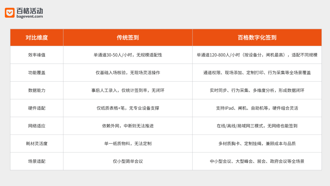 传统签到是“单一核验工具”,仅能满足基础需求,且存在效率低、数据废、适配差的问题;而百格数字化电子签到是“会议现场管理中枢”,通过功能适配场景、数据驱动决策、硬件灵活组合,不仅解决了传统签到的核心痛点,更构建起“会前信息收集-会中现场管理-会后数据分析”的完整闭环,大幅提升主办方管理效率与参会者体验,成为现代会议管理的刚需解决方案。